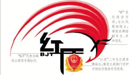 红盾代表工商,寓意工商部门守护市场经济健康有序发展,周边饰以符号化的剑兰叶,寓意廉洁奉公、忠于职守。同时巧妙地融入了白碱滩区的地域缩写,展示了此项活动的专属意义。利用“先锋”的首字母缩写组合,以凤凰的形象予以展示,寓意出乎其类,拔乎其萃,预示着红盾先锋品牌建设铿锵有力、步步领先。图标用最醒目的红黑搭配显得大气凝重,红色代表了蓬勃与生机,生命与力量。